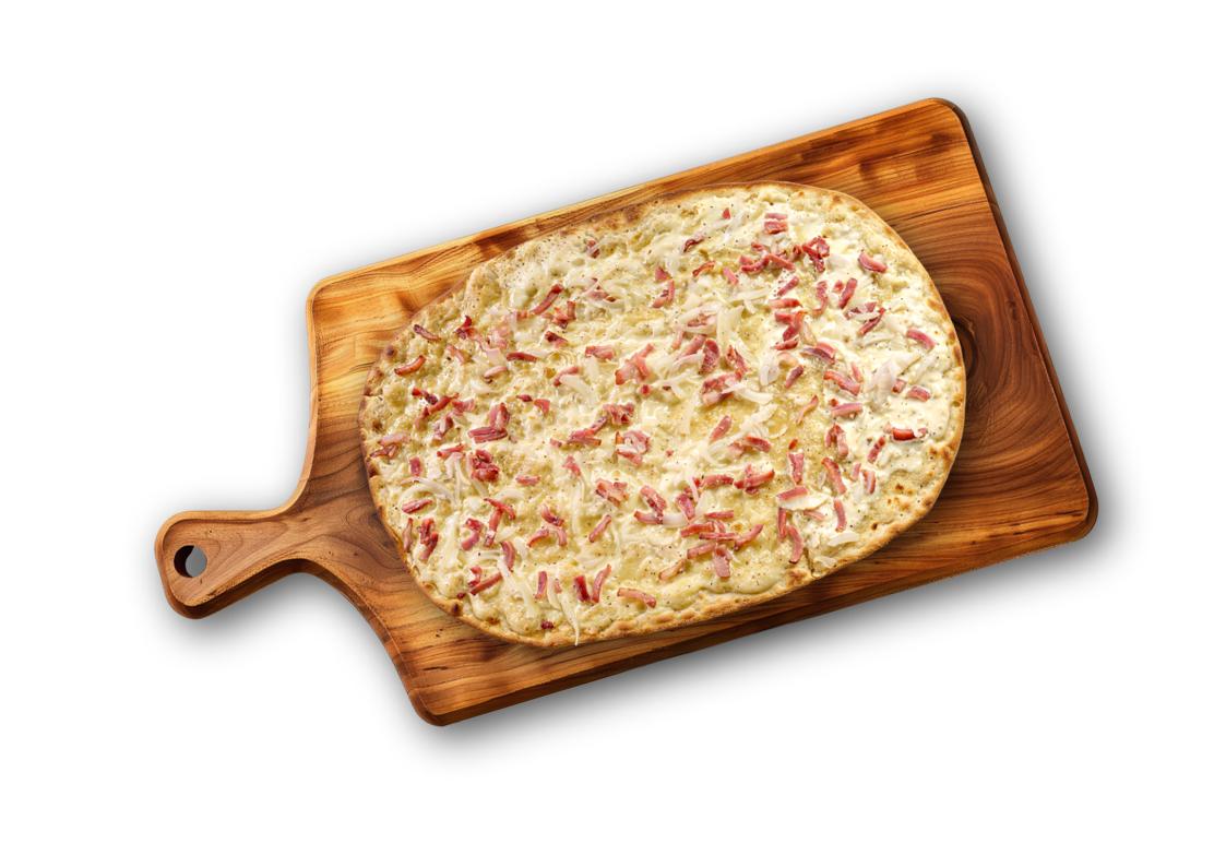 Fine et croustillante, notre flammekueche est élaborée avec soin pour retrouver toute la légèreté et le goût authentique de la recette traditionnelle alsacienne.